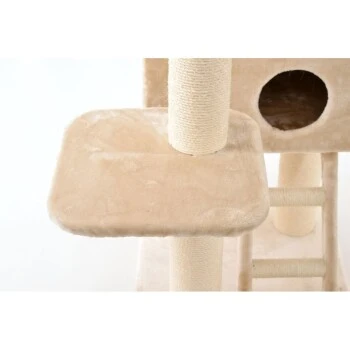 Ob verschmust oder verspielt, dieser Kratzbaum passt für jede Katze. Auch kleine oder ältere Katzen können Dank der Leiter hier spielend leicht den Aufstieg zur gemütlichen Höhle schaffen. Die starken Holme (Ø ca. 12 cm) laden regelrecht zum herumtoben und klettern ein. Danach kann auf der oben angebrachten runden Liegeplatte mit Halbrand (Ø ca. 45 x H12 cm) oder in der Hängemulde eine erholsame Pause eingehalten werden, bevor es zur nächsten Klettertour los geht. Alle Liegeflächen sind mit einem dichten, samtig-weichen Plüsch bezogen und die extra große Bodenplatte sorgt durch ihr hohes Eigengewicht für eine optimale Standsicherheit.